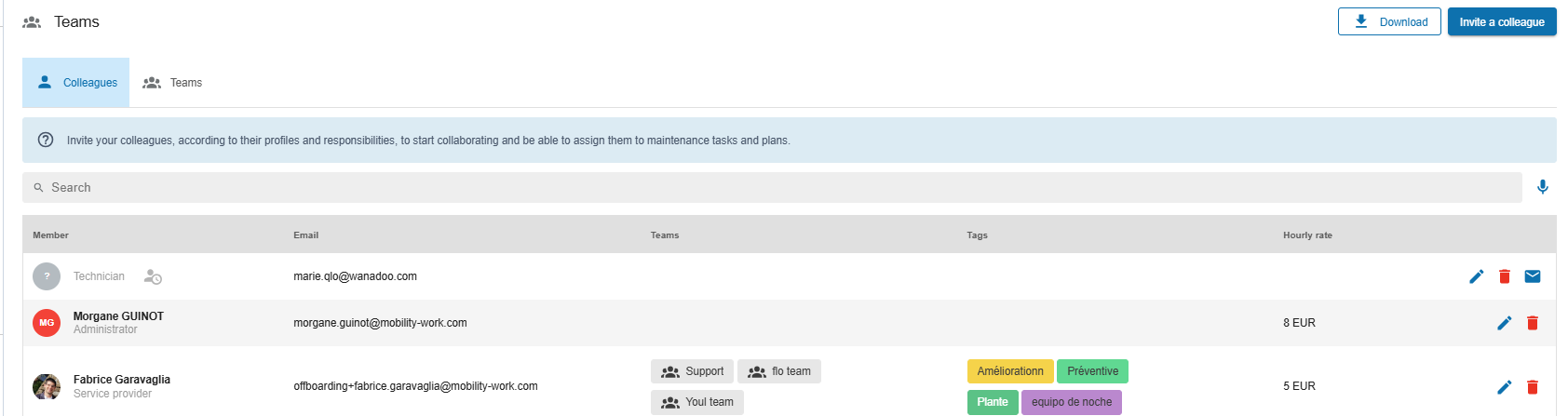 The Colleagues page in the Teams menu lists all network users and allows administrators to manage members: invite, modify, delete, and organize users.