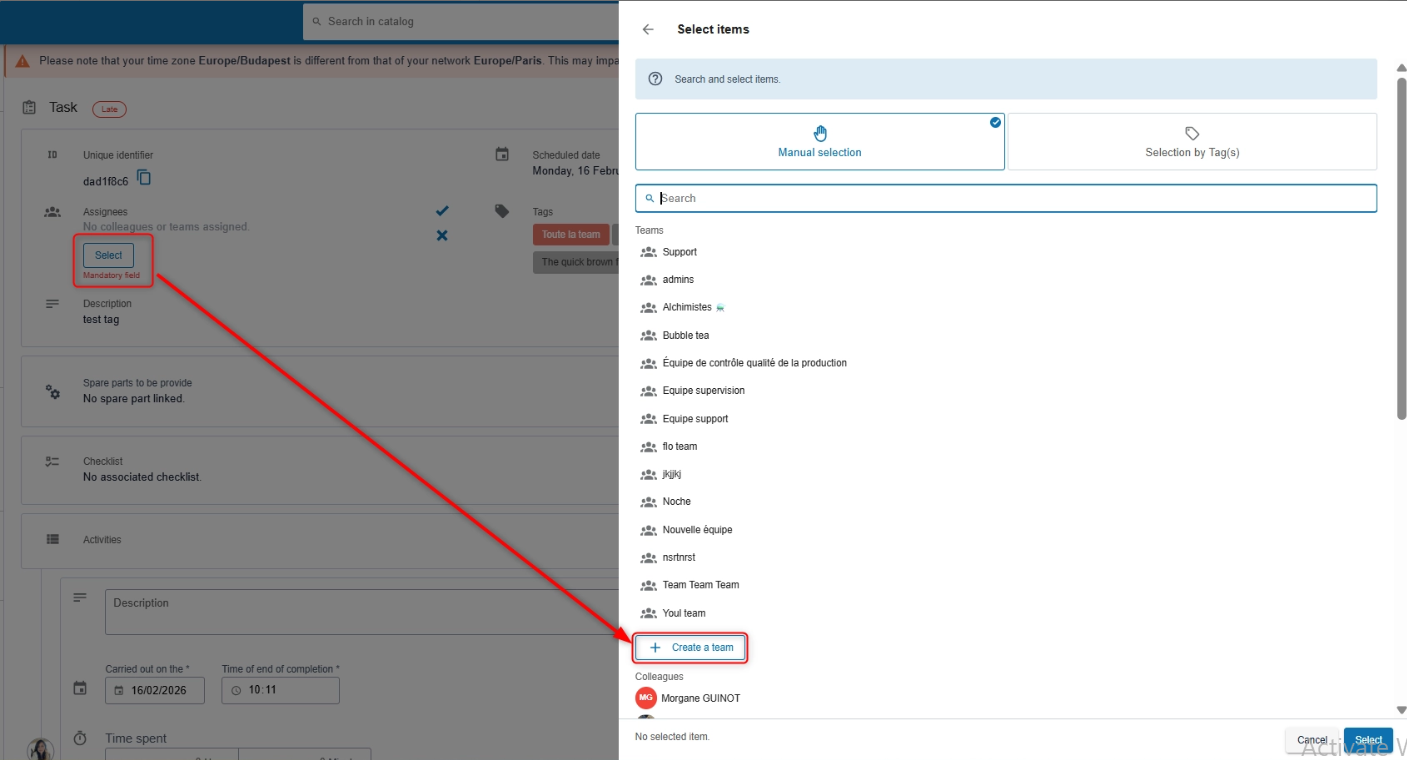 The newly created team is automatically assigned to the related task or maintenance plan.