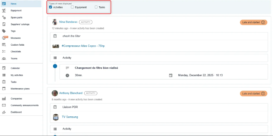 You can choose to display only the types of news you’re interested in from the three available categories: tasks, activities, and equipment.