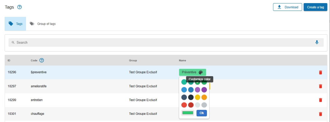 To improve readability and categorization, you can assign a color to a tag.