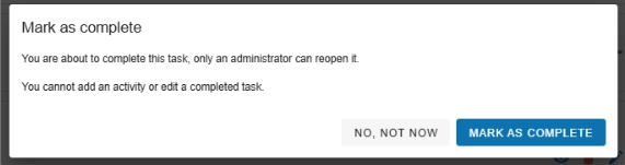 Once a task is marked as completed, it can no longer be modified or updated with additional activities.