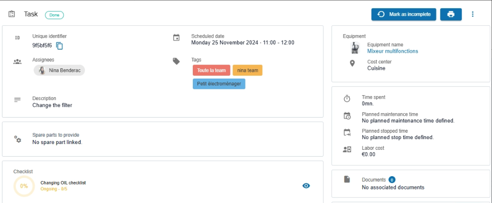 Once the user has completed the intervention, they can mark the task as completed. The Mark as completed button is available at the top right of the page. Once marked as completed, the task can no longer be modified. Only the network administrator will be able to reopen the task.
