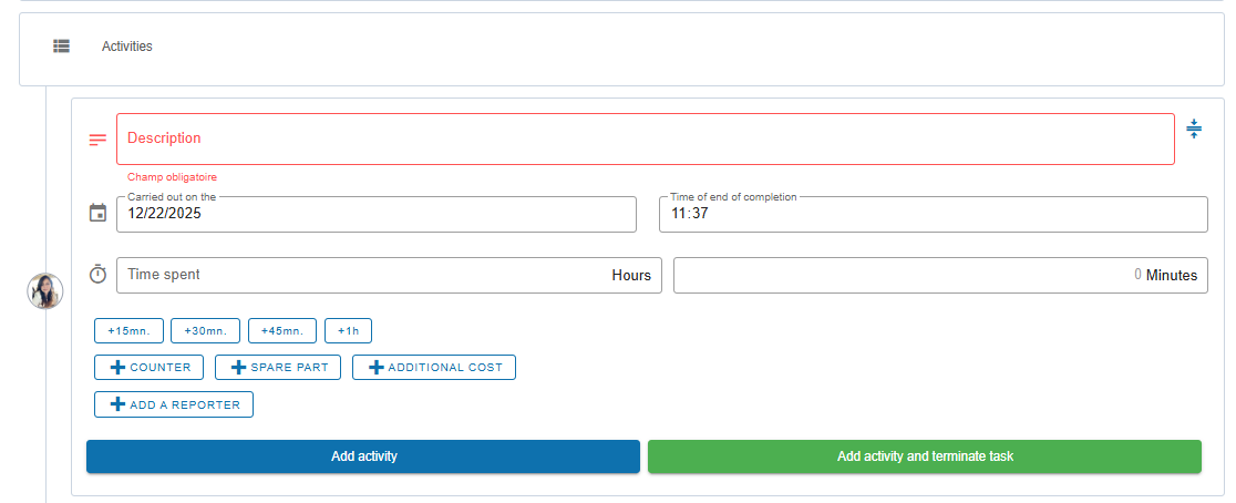 If the user enters a counter, a spare part, or an additional cost, it will be added only to their own activity, and not to that of the technician.