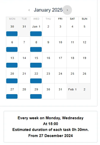 Throughout the scheduling process, you can rely on the calendar which shows upcoming tasks for your maintenance plan, along with the defined rule, dynamically updated with each change in parameters.
