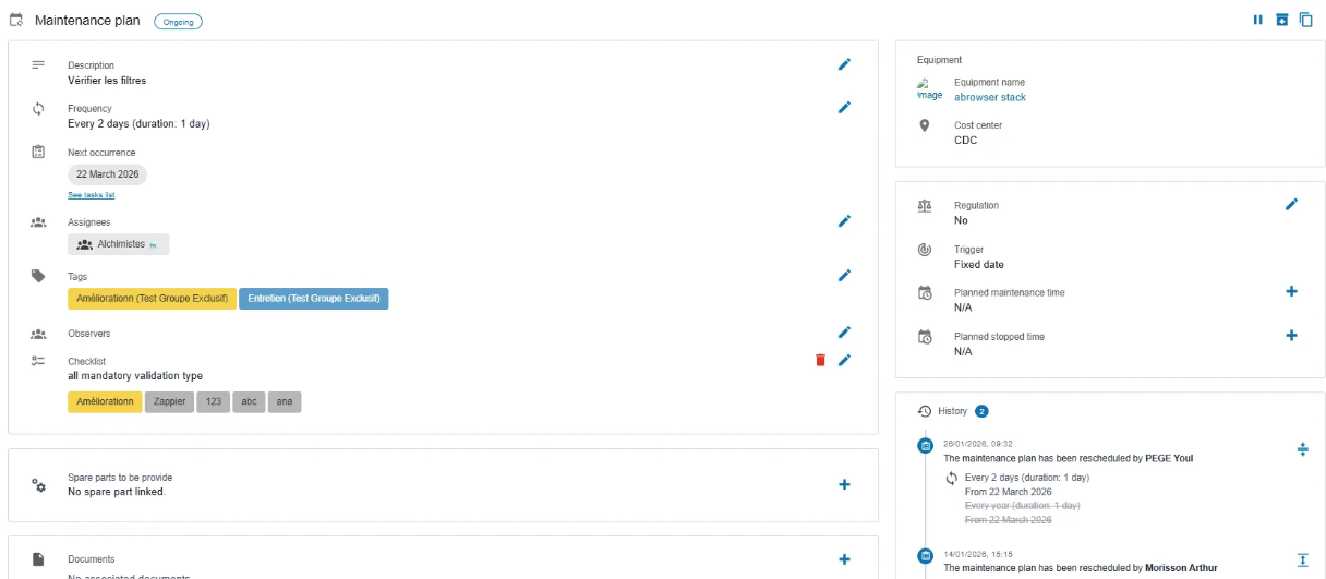 The History section, located on the right-hand side, allows you to see the changes made to the plan’s schedule. For example, if the plan has been postponed or its frequency modified, the history will show the details of: