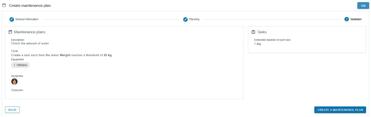 Once all parameters are chosen, you can proceed to the validation step. This consists of checking that the schedule and information are correctly filled in, and that the plan can be created.