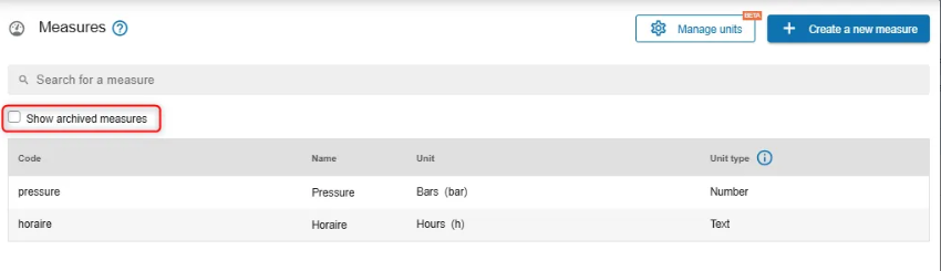 To view archived measures, check the box “Show archived measures” above the table. Archived measures will appear crossed out in the list.