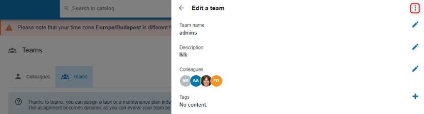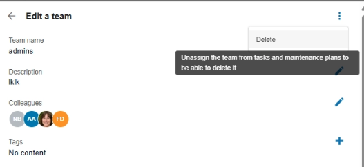 Tip: Before deleting a team, make sure it is no longer used in any task or maintenance plan. You can unassign the team from all existing tasks to enable deletion.
