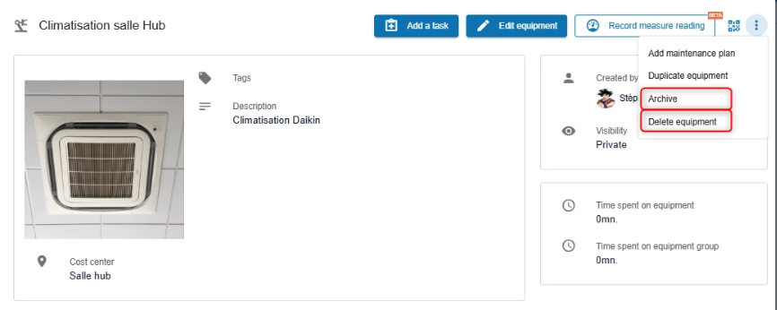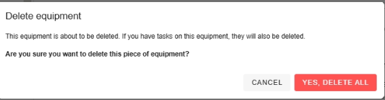 ⚠️ Important note: Deleting a piece of equipment will delete all associated tasks and maintenance plans (MRPs). This information will then disappear from your analyses and history.