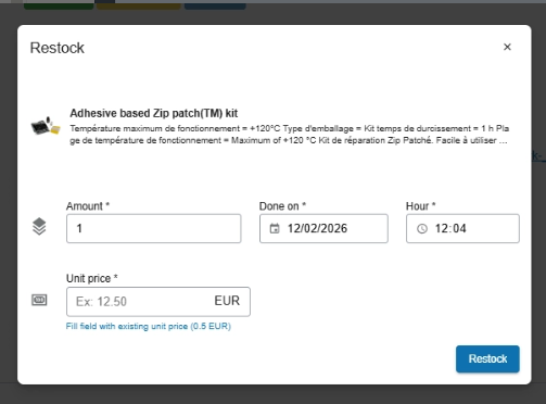 - Click Restock to confirm the stock update.