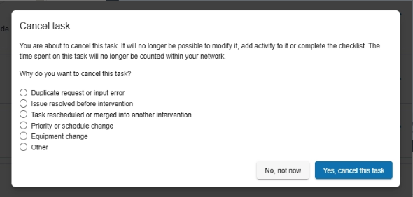 Canceling a task indicates that an intervention will not take place, while preserving the consistency and history of the maintenance plan.
