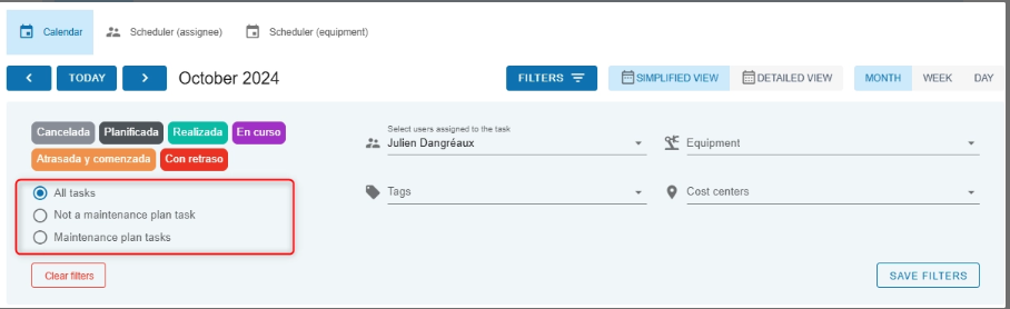 Saved searches are available on pages that offer search filters (for example: tasks, equipment, requests, etc.).