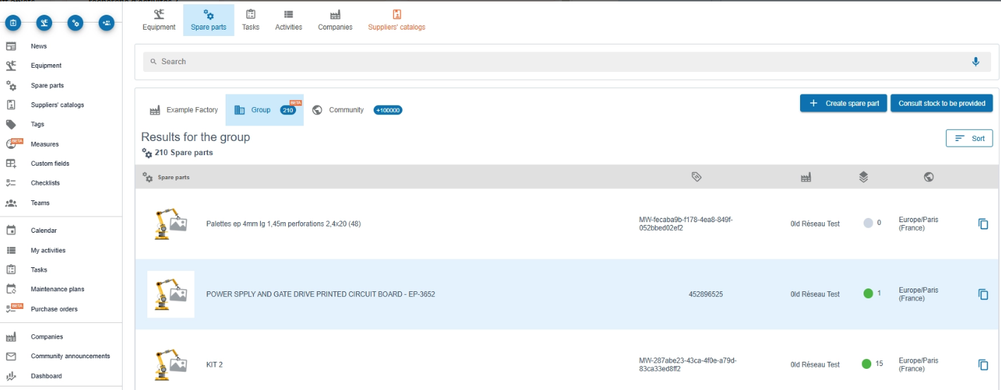 The group search feature allows you to check whether a spare part is available in the inventories of other sites within your group.