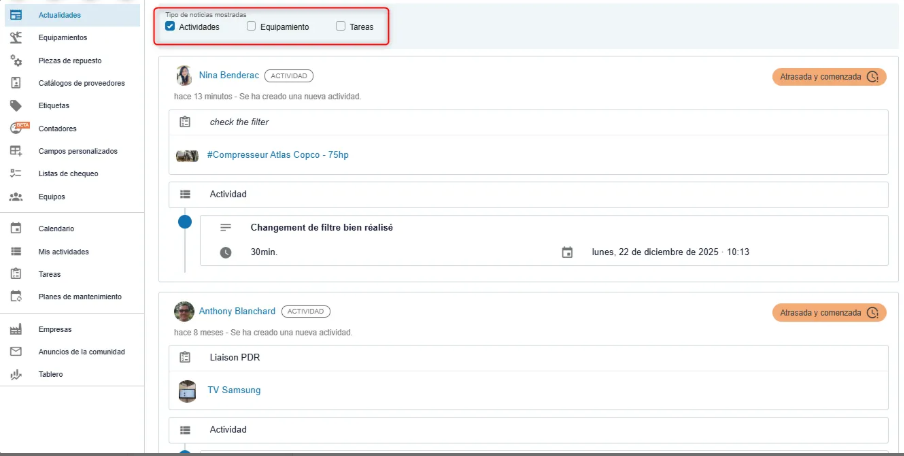 Puede elegir mostrar solo los tipos de noticias que le interesan entre las tres categorías disponibles: tareas, actividades y equipos.