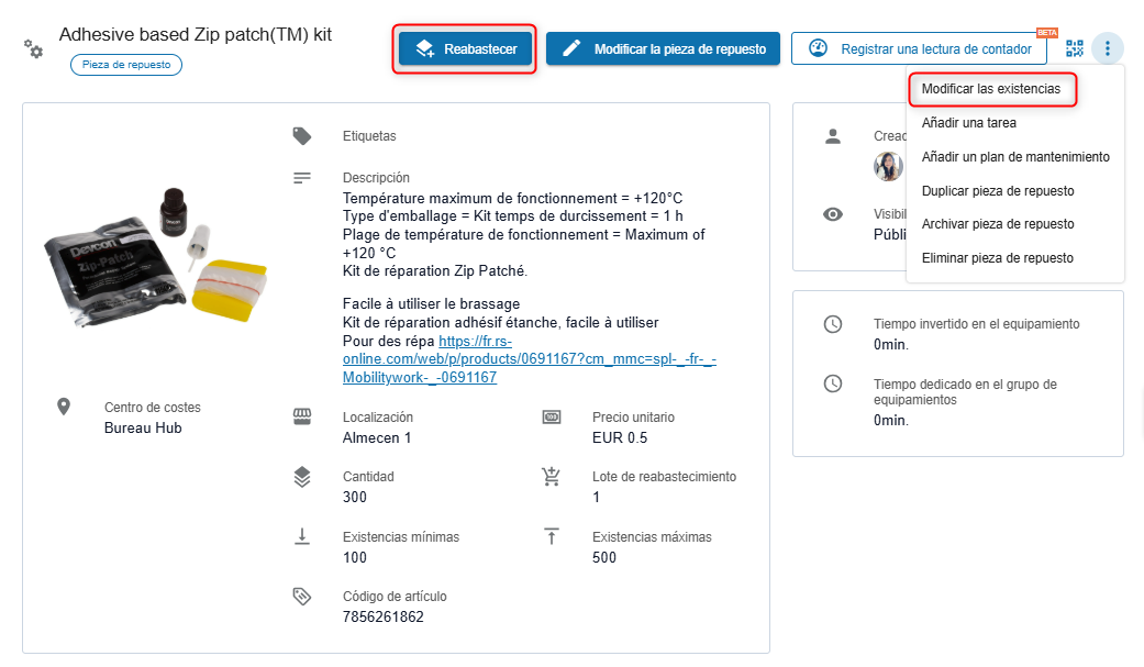 Es posible almacenar una cantidad adicional en su GMAO, aunque no haya reabastecido físicamente su inventario. La opción Modificar las existencias permite hacer un conteo preciso de todas las unidades de inventario disponibles en un momento determinado, verificar y documentar la cantidad actual de cada artículo en el inventario. Esta opción permite registrar una cantidad superior o inferior a la cantidad real.