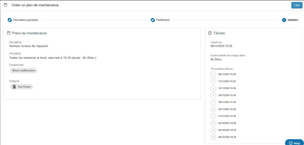 A lo largo de la programación, puede confiar en el calendario que muestra las tareas próximas de su plan de mantenimiento, junto con la regla definida, actualizada dinámicamente con cada modificación de parámetros.