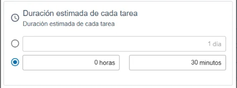 La duración estimada de las tareas puede definirse en días, horas o minutos.
