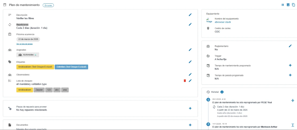 La sección Historial, ubicada en el panel derecho, permite ver los cambios realizados en la programación del plan. Por ejemplo, si el plan se ha pospuesto o se ha modificado su periodicidad, el historial mostrará los detalles de: