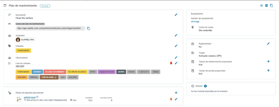 - Etiquetas (opcional): Facilitan la clasificación de tareas. Las etiquetas pueden predefinirse para describir la orden de trabajo, indicando información como el nivel de urgencia, posibilidad de intervención sin detener la máquina, etc. Para obtener más información sobre el uso de etiquetas, haga clic aquí.