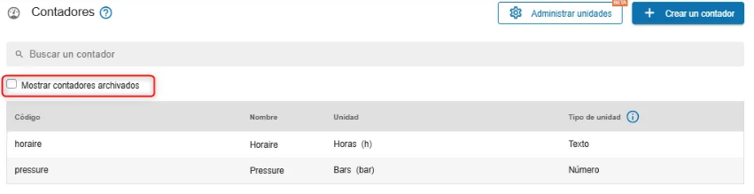 Para ver los contadores archivados, marque la casilla “Mostrar contadores archivados” sobre la tabla. Los contadores archivados aparecerán tachados en la lista.