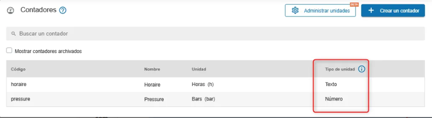 Abra la página de Contadores desde el menú Contadores. El tipo de unidad se mostrará en la columna correspondiente.