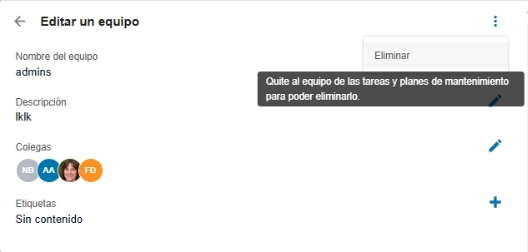 Consejo: Antes de eliminar un equipo, asegúrese de que ya no se utilice en ninguna tarea o plan de mantenimiento. Puede desasignar el equipo de todas las tareas existentes para poder eliminarlo.