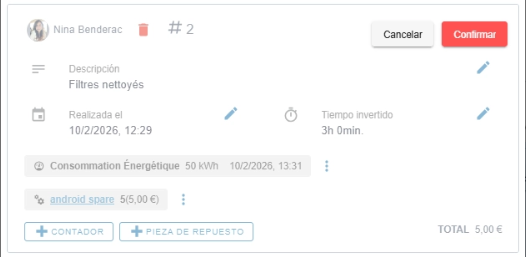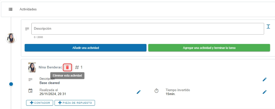 - Impacto en tareas y piezas: Si la actividad contiene piezas de repuesto o contadores registrados, su eliminación revertirá los movimientos de stock asociados.