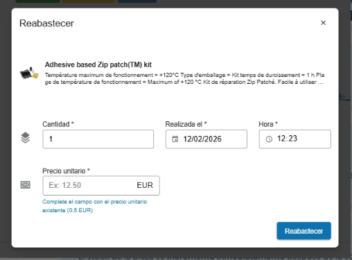 - Haz clic en Reabastecer para confirmar la actualización del stock.