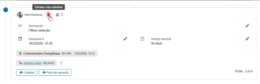 Haga clic en el botón Eliminar disponible en la actividad correspondiente.