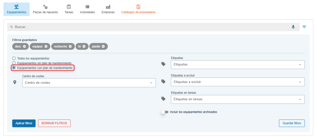 Puede obtener la lista de los equipamientos en los cuales se planificaron planes de mantenimiento. Por eso, sólo tiene que utilizar la búsqueda de equipamientos, hacer clic en el filtro “equipamiento con un plan de mantenimiento”.