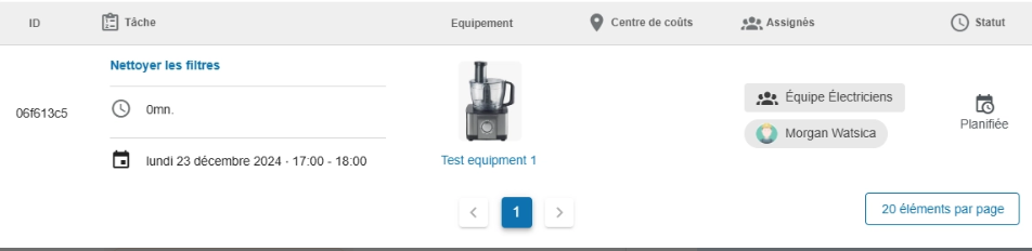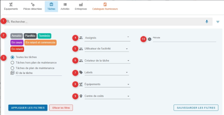 Filtrer les tâches par équipement ou centre de coûts