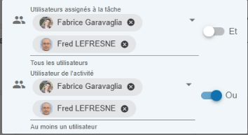 - Et : affiche les tâches où toutes les personnes sélectionnées sont impliquées
