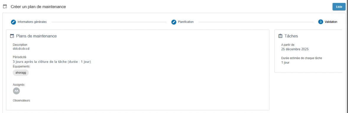 Une fois créé, le plan de maintenance s’affiche avec les informations suivantes :