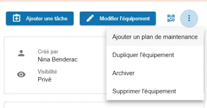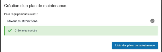 - Équipements (obligatoire): choisir l’équipement ou la pièce détachée pour laquelle le plan de maintenance est en train d’être créé.