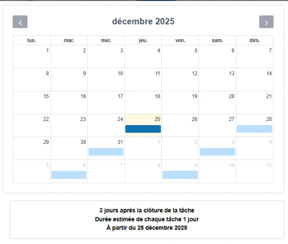 Pour illustrer, si nous avons choisi une fréquence 3 jours après la clôture de tâche, et que le plan commence le 25/12/2025, voici l’enchainement potentiel des tâches.