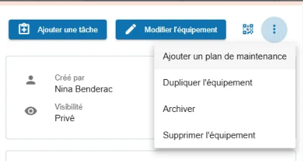 - Équipements (obligatoire): choisir l’équipement ou la pièce détachée pour laquelle le plan de maintenance est en train d’être créé.