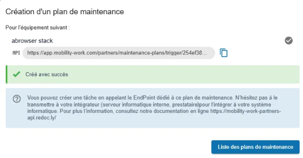 Si le payload est valide et que votre API Key* ainsi que l'ID du plan de maintenance sont corrects, la réponse sera un code HTTP 200.