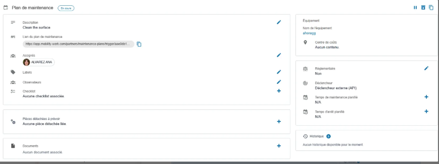 Une fois créé, le plan de maintenance s’affiche avec les informations suivantes :