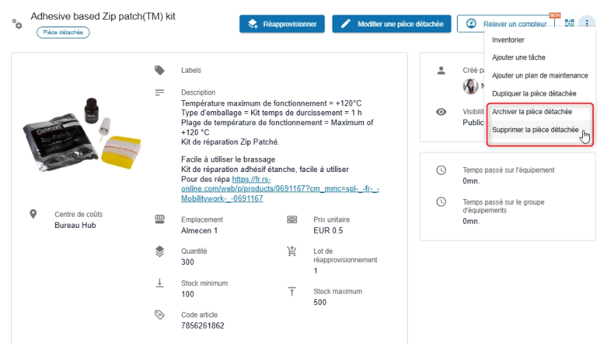 Si vous souhaitez conserver l’historique des interventions et des données associées, nous vous recommandons d’archiver la pièce détachée plutôt que de la supprimer définitivement.
