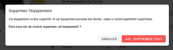 - S’il y des tâches créées sur la pièce détachée, celles-ci seront également supprimées.