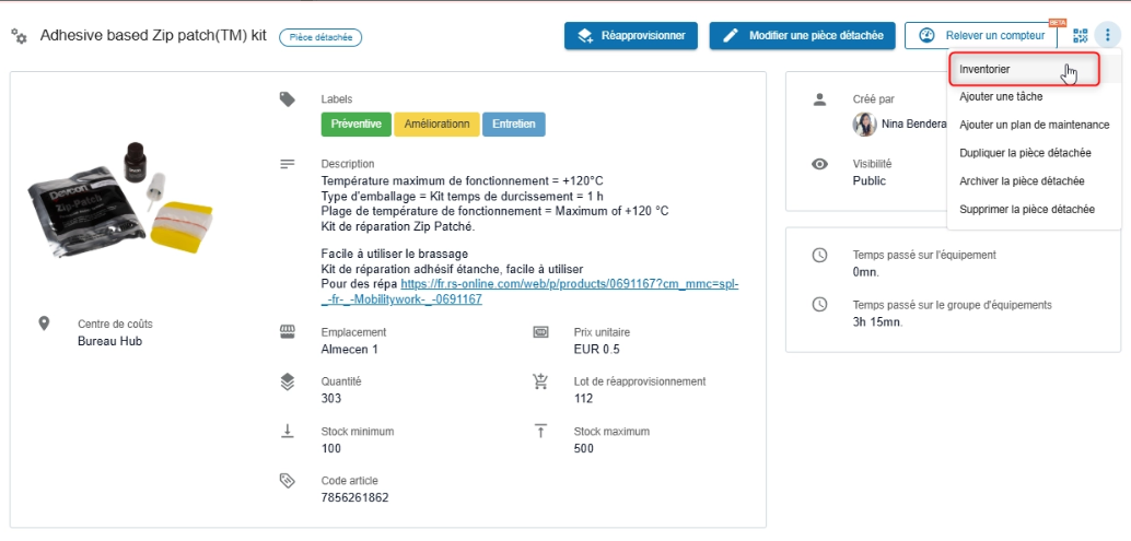 - Accédez à l’onglet Pièces détachées ou ouvrez la fiche de la pièce à inventorier.