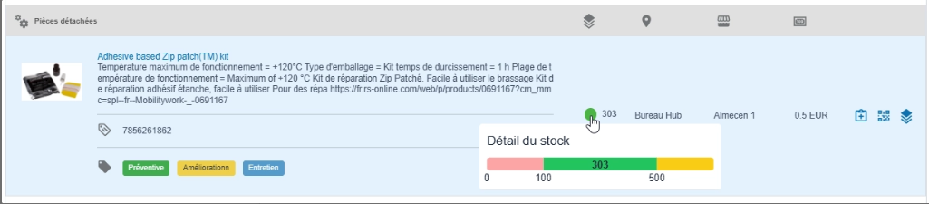 - Dans les résultats, survolez la pièce avec la souris pour afficher le stock détaillé.