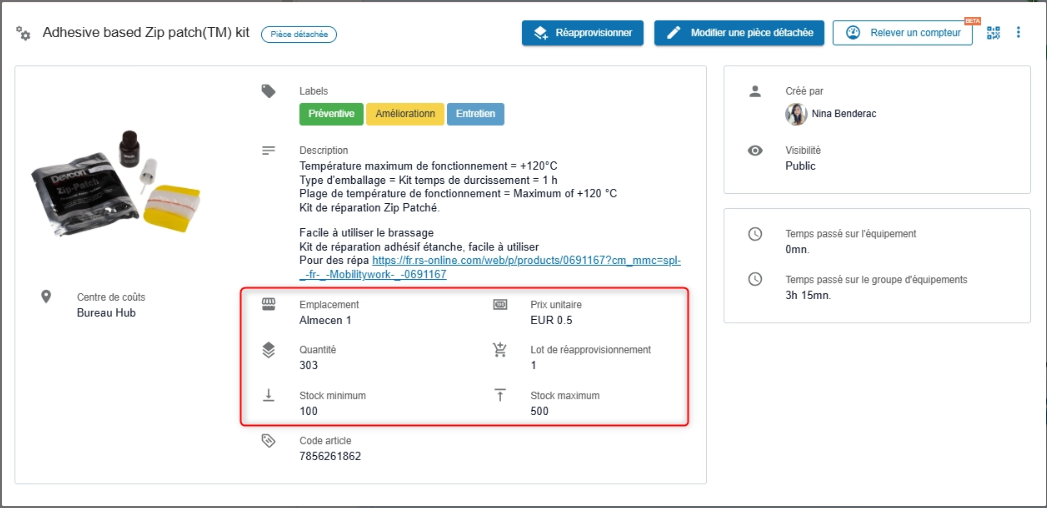 Cette vue permet également de vérifier toutes les informations liées à la pièce, avant d’effectuer un réapprovisionnement ou un inventaire.