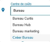 - Si aucun résultat ne correspond à votre saisie, le menu déroulant propose l’option Créer pour le centre de coût saisi.