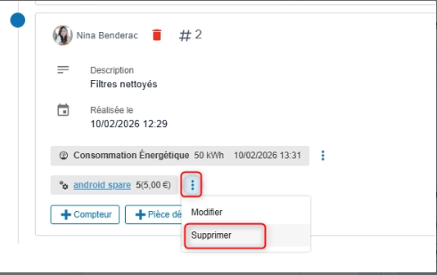 Lorsque vous annulez ou supprimez une tâche, les pièces consommées ne sont pas automatiquement remises en stock. Les mouvements de stock étant indépendants de la tâche, ils doivent être annulés manuellement pour réintégrer les quantités dans l’inventaire.