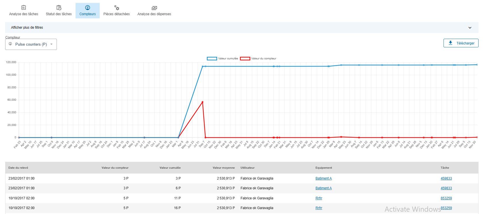 Le Tableau de bord Compteurs vous permet de retrouver les données concernant les valeurs des relevés compteurs saisis lors des interventions de maintenance.